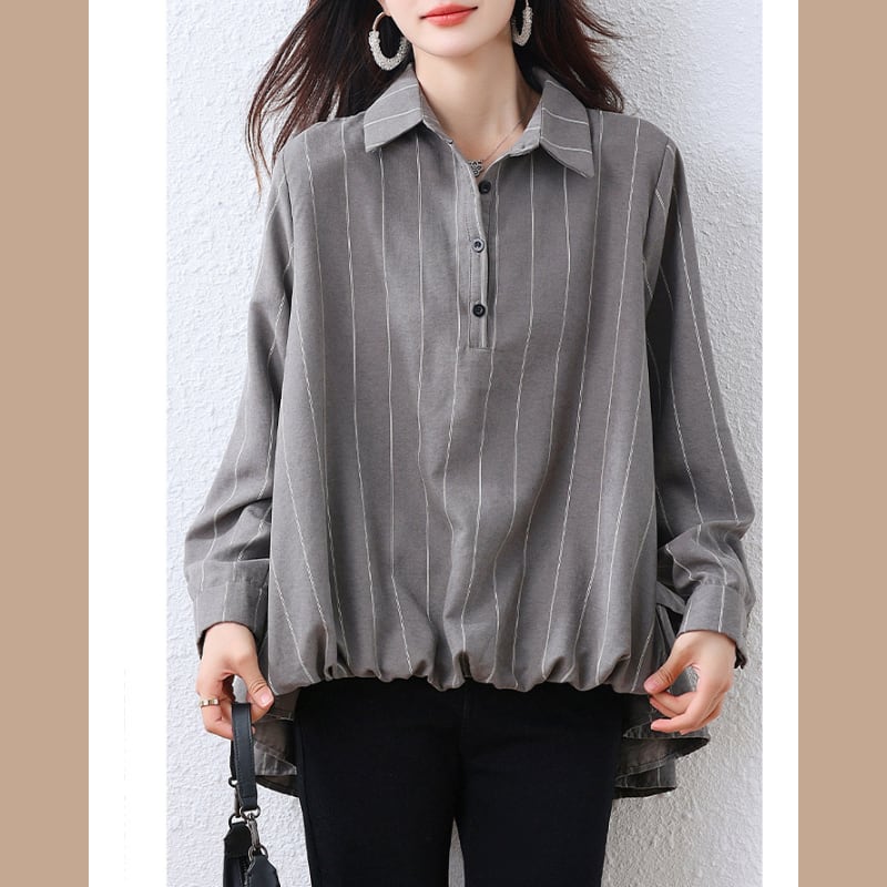 襟付き前ボタンのグレーのストライプシャツです