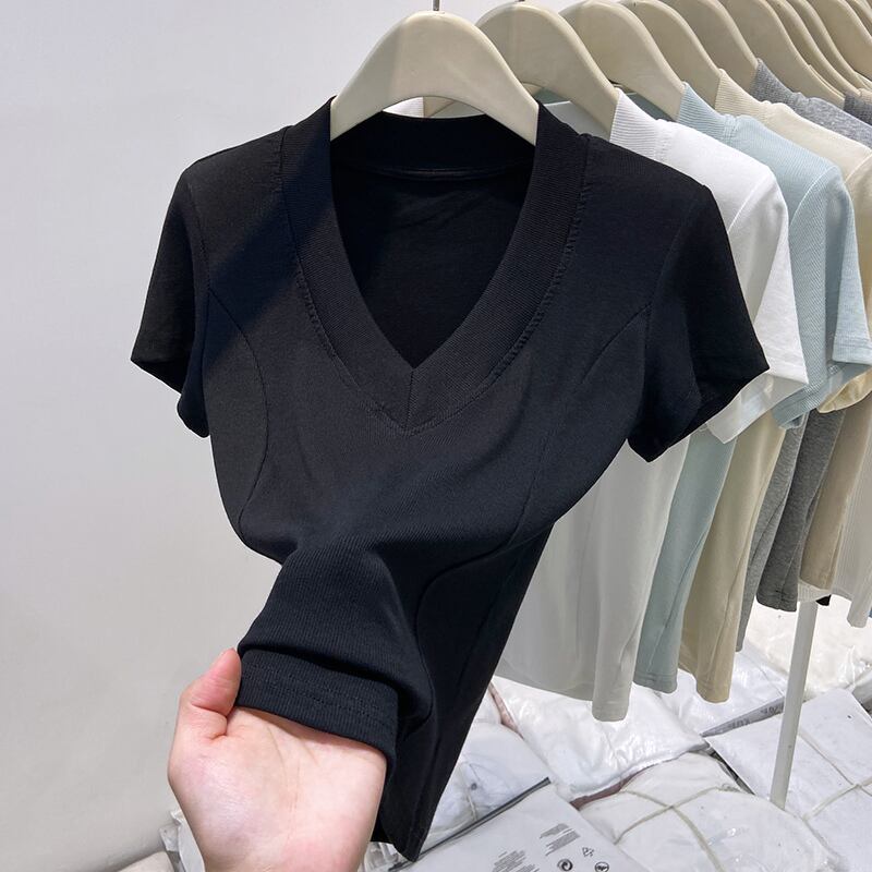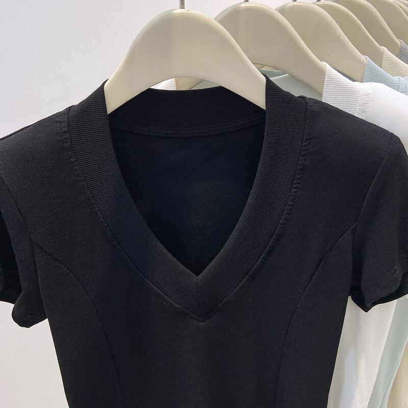 Vネック半袖スリムニット E00021