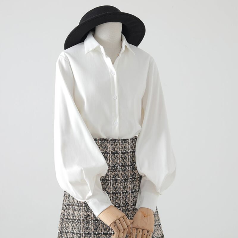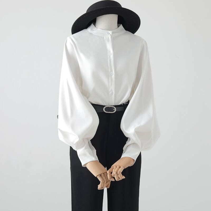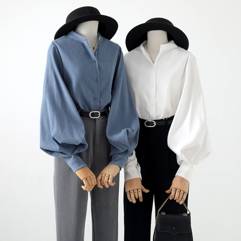 スタンドカラー・立ち襟キーネック2種パフスリーブ長袖シャツ E00350