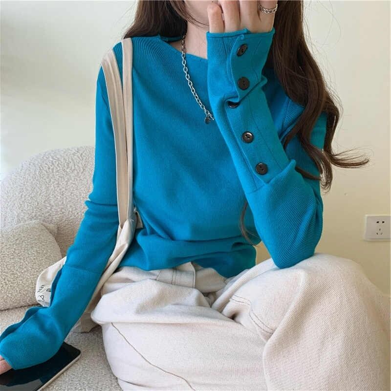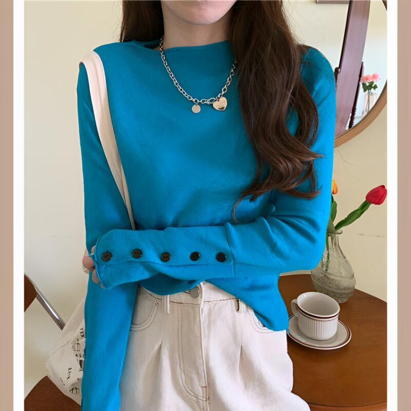長めの袖にボタンが付いているおしゃれな長袖ニットです