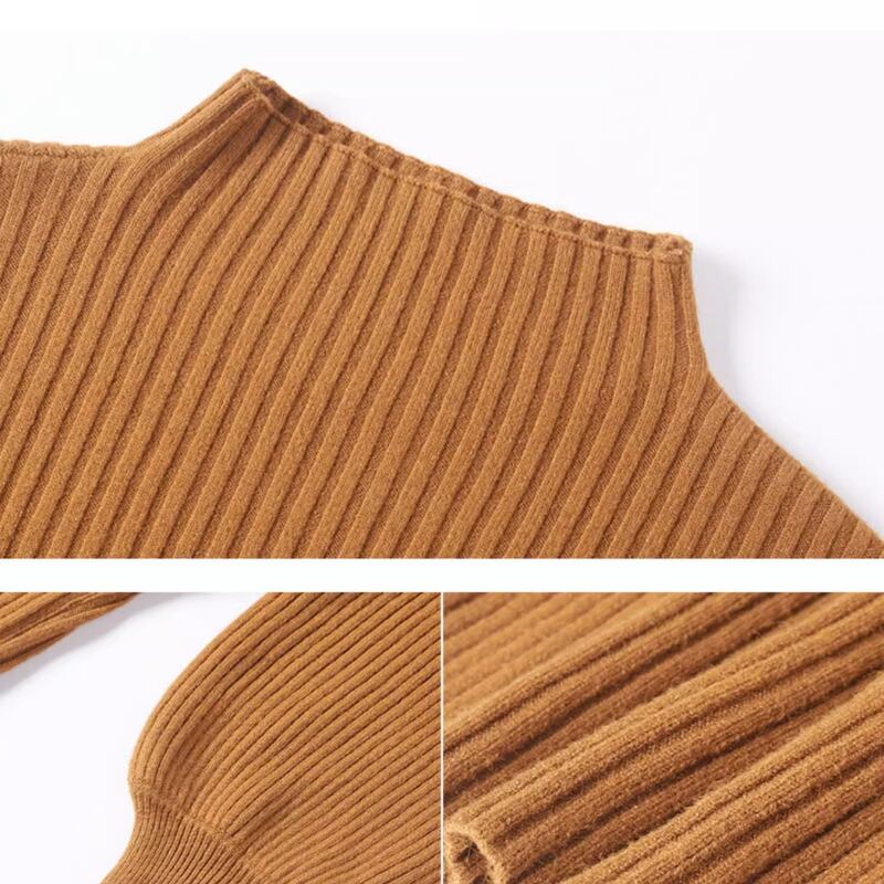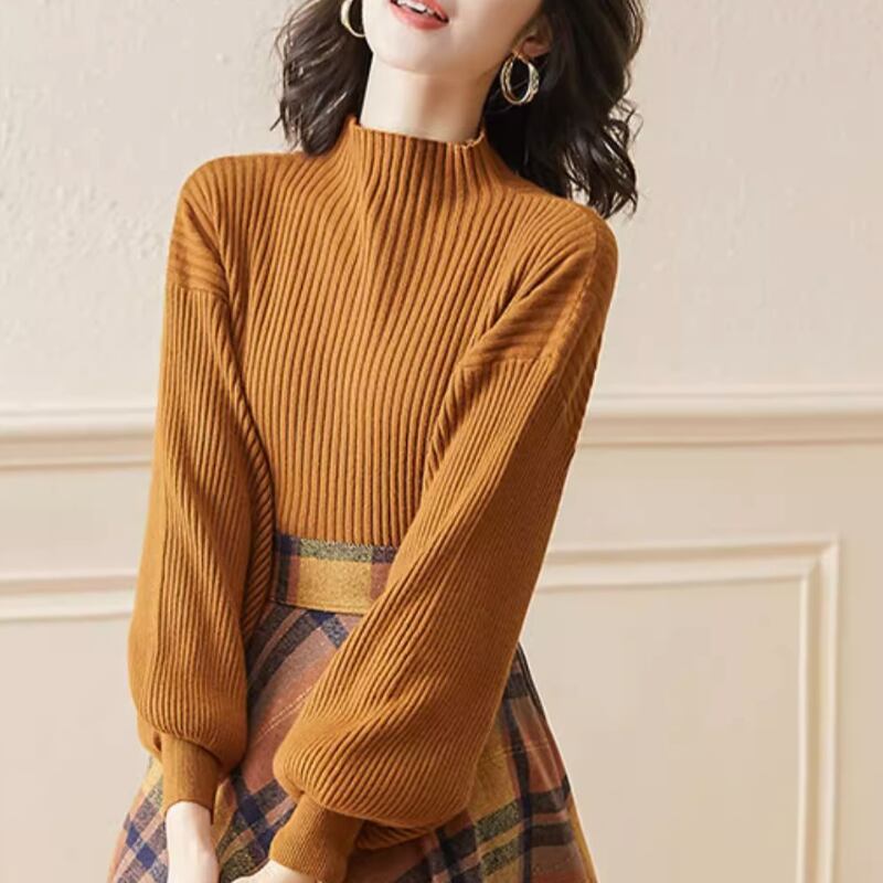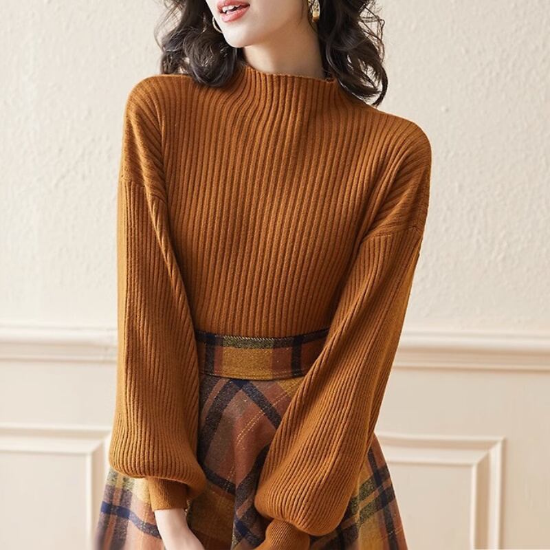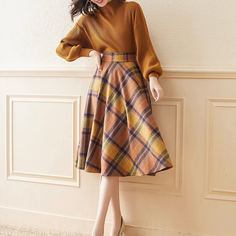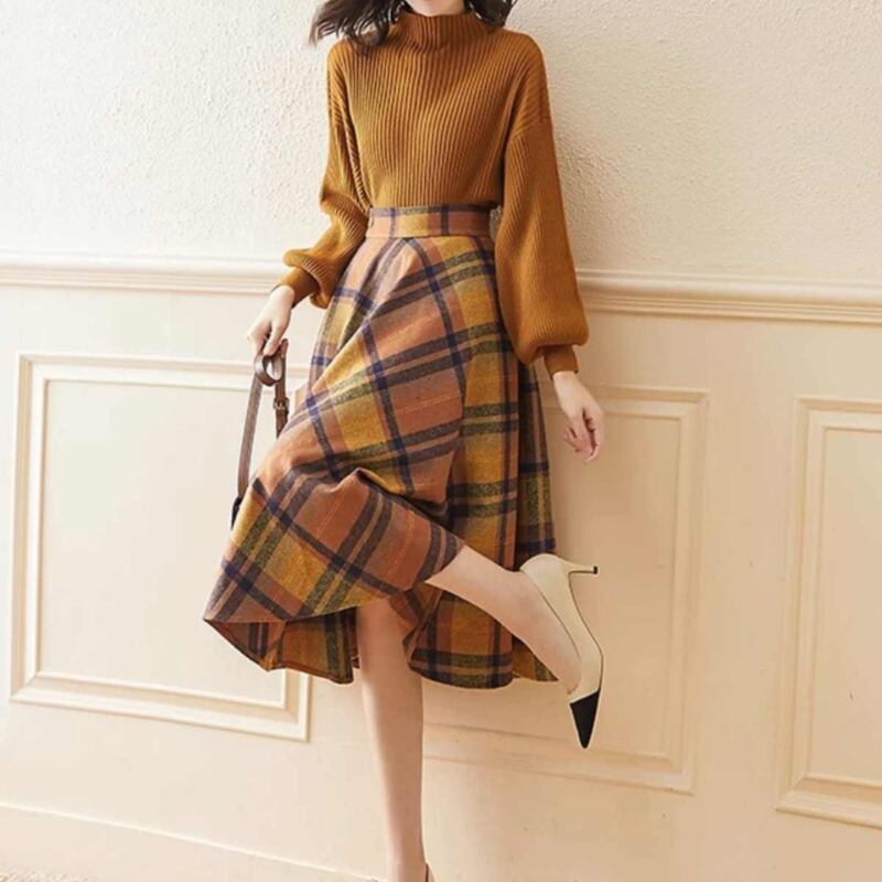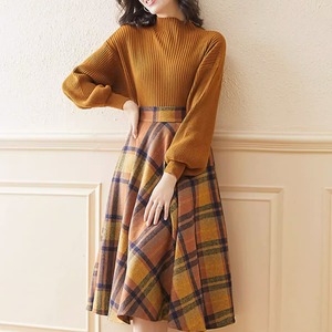 ハイネックボリュームスリーブとチェックスカートセット E00438
